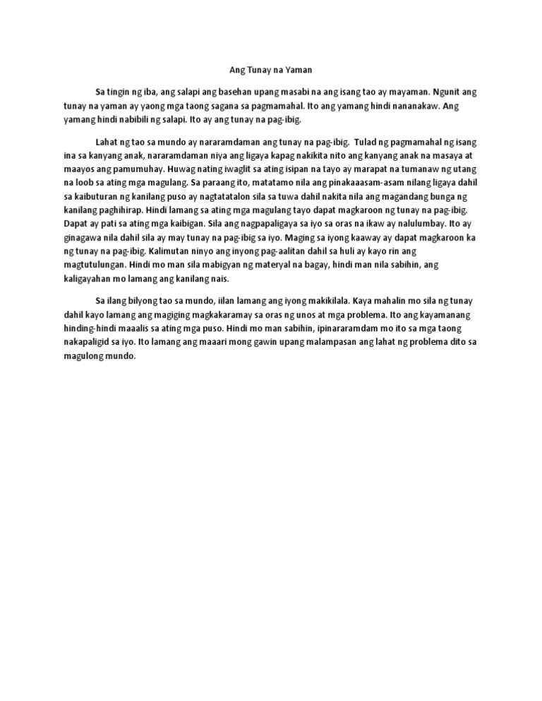 Sanaysay Halimbawa In this lesson you will learn about Sanaysay and example o halimbawa of sanaysay in TagalogAng mga maikling replektibong halimbawa ng sanaysay Tagalog tungkol sa edukasyon wika pandemya kabataan pangarap kaibigan kahirapan pag-ibig magulang at pamilya atbp. Sino ang mahal mo. Dahil naging bukas-palad ako sa materyal may napansin akong kakaiba sa sarili ko sa nakalipas na mga taon.