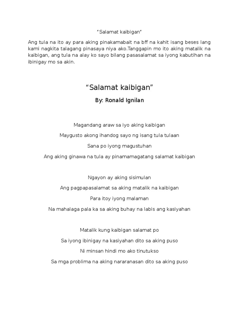 At ito ang tula na pinapamagatang Para Sa Matalik Kong Kaibigan. SA KUNG SINO AT ANO AKO SA ORAS NA TO. By Shaira De Guzman shared on He Said She Said Kaibigan isang taong kailanmay Hinding-hindi ko makalilimutan.
