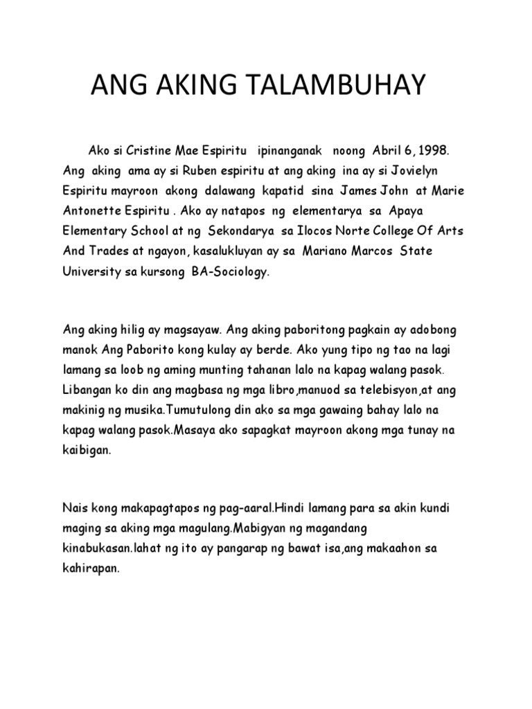 Nagpapasalamat ako nang walang humpay at kayoy aking nakilala. Bigla akong tumayo na nanikip ang dibdib. ANG AKING TALAMBUHAY Marami ang nagsasabi na ang pinakamasayang araw na nangyari sa ating buhay ay ang ipinanganak tayo kaya dapat ating pahalagahan at pagyamanin ang buhay na ipinagkaloob sa atin ng maykapal.
