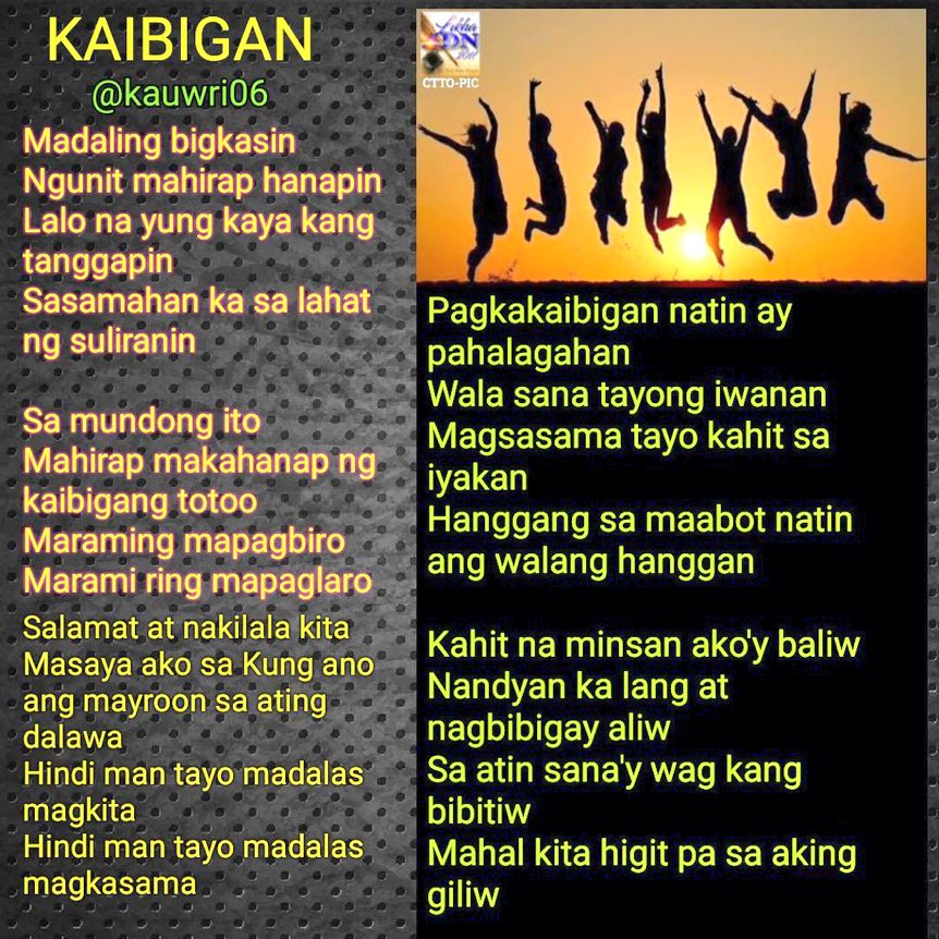 Samantala ang mga tula tungkol sa kaibigan na inyong matutunghayan ay hango sa mga tunay na karanasan ng mga manunulat. Dapat matuto tayong bumitaw. Kung may isinuksok may mabubuntis.