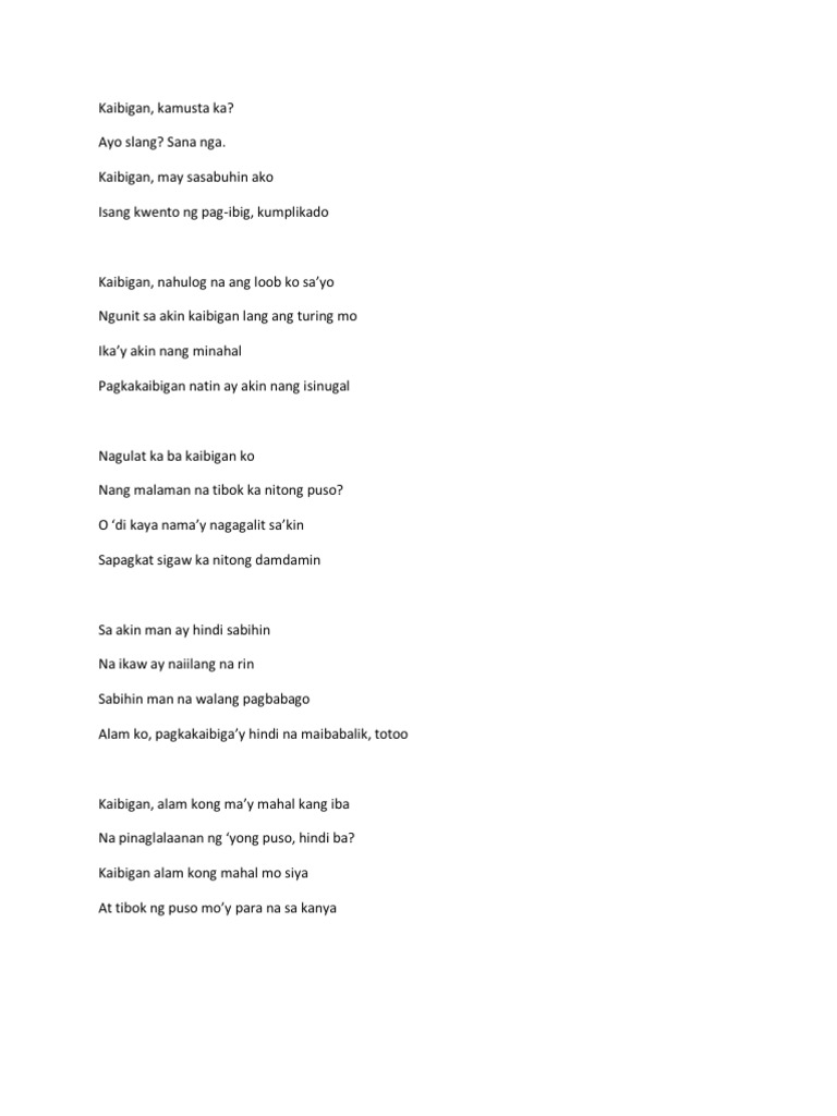 Sa malamig na ulan ng Disyembre. Sa bawat sandal ng ating buhay. Ikaw ay isang mabuting kaibigan Tayo ay laging nagkwekwentuhan Hanggang sa nahulog ang loob sa iyo At ikay lumayo sa piling ko.
