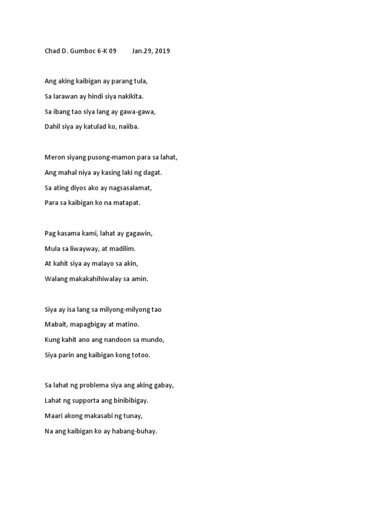 Kaibigan ko nga ba si zonia ay isang mabait masayahin at matalinong dalaga halos lahat nasa kanya na kaya sya ay hinangangaan ng iba. Mga Tula Pdf. Dahil dito karaniwang makikita ang mga tula ukol sa pag-ibig.