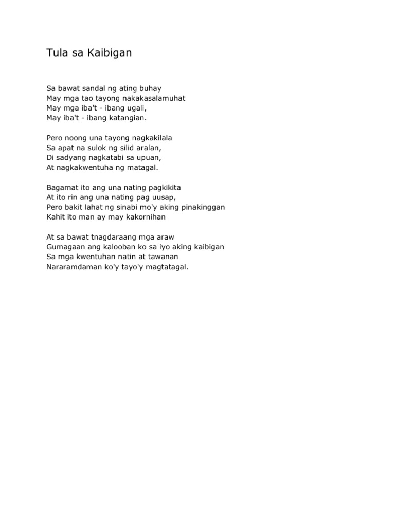 Tula sa isang kaibigan Hindi kilalang Hindi kita mabibigyan ng mga solusyon para sa lahat ng mga problema sa buhay o wala rin akong mga sagot para sa iyong mga pag-aalinlangan o takot ngunit maaari kang makinig sa iyo at ibahagi ito sa iyo.