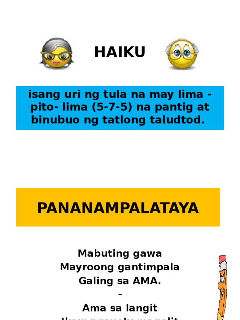 Ang haiku ay isang uri ng tula na may lima-pito-lima 5-7-5 na pantig. 5 stanza na tula Filipino poem about prayer halimbawa ng tulang Filipino tungkol sa pagdarasal o pananalangin limang saknong na tula. Please see our SITEMAP to browse all tagalog poems and their respective authorscontributors.